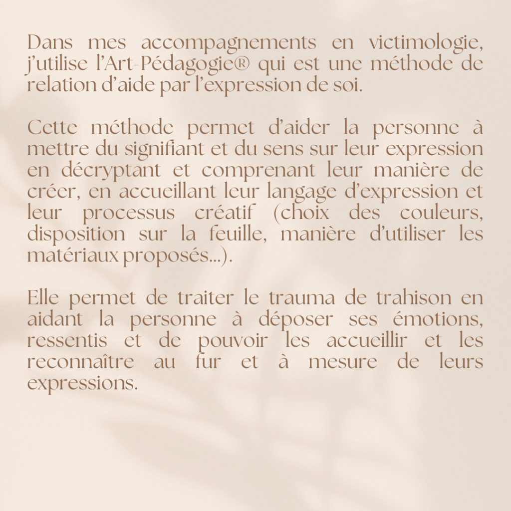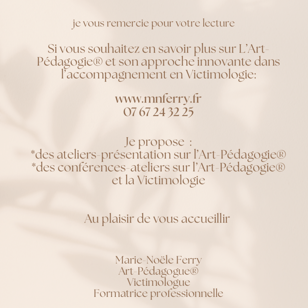 Comme vous vous intéressez au trauma de trahison, si cela vous intéresse, j’anime ce jeudi 21 novembre de 19h à 21h30, une conférence-atelier gratuite pour présenter l’Art-Pédagogie® au service de la victimologie.