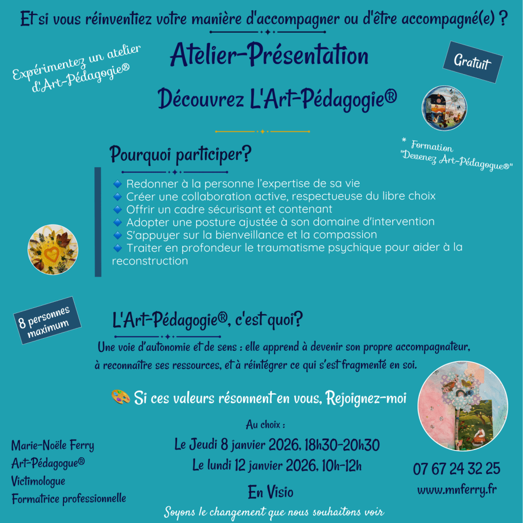 L’Art-Pédagogie® ouvre un espace où chacun peut exprimer, comprendre et transformer son vécu, traiter l’effraction traumatique grâce à la créativité, au sens et à un accompagnement réellement bienveillant.