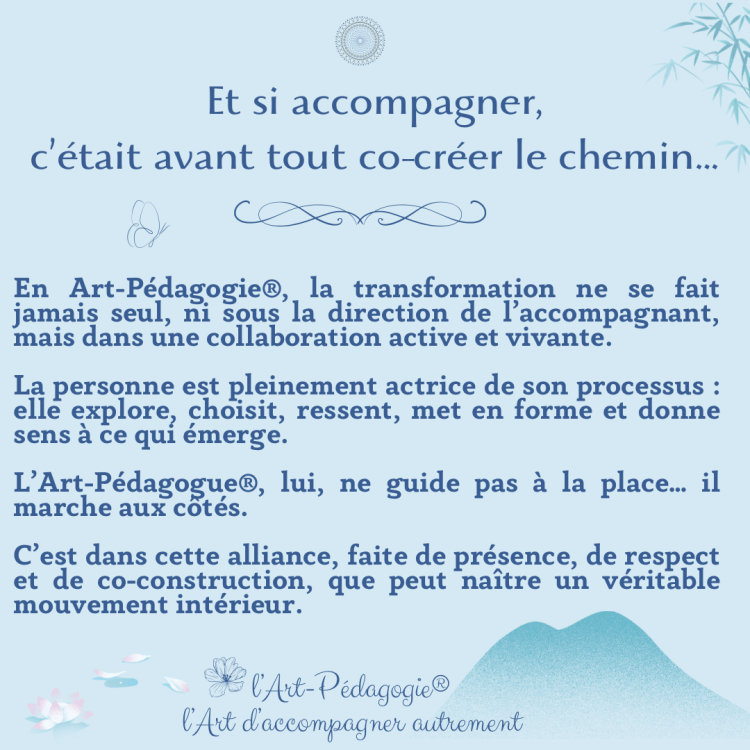 🎐 L’Art-Pédagogue® n’est pas là pour diriger, mais pour soutenir, accueillir et offrir un cadre sécurisant dans lequel la personne peut s’autoriser à être pleinement elle-même.