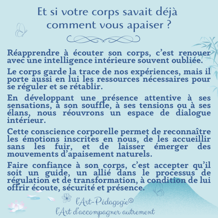 🎐 Dans l’accompagnement, notamment en Art-Pédagogie®, nous réapprenons à passer par le corps : ressentir, déposer, représenter… puis mettre en mots.