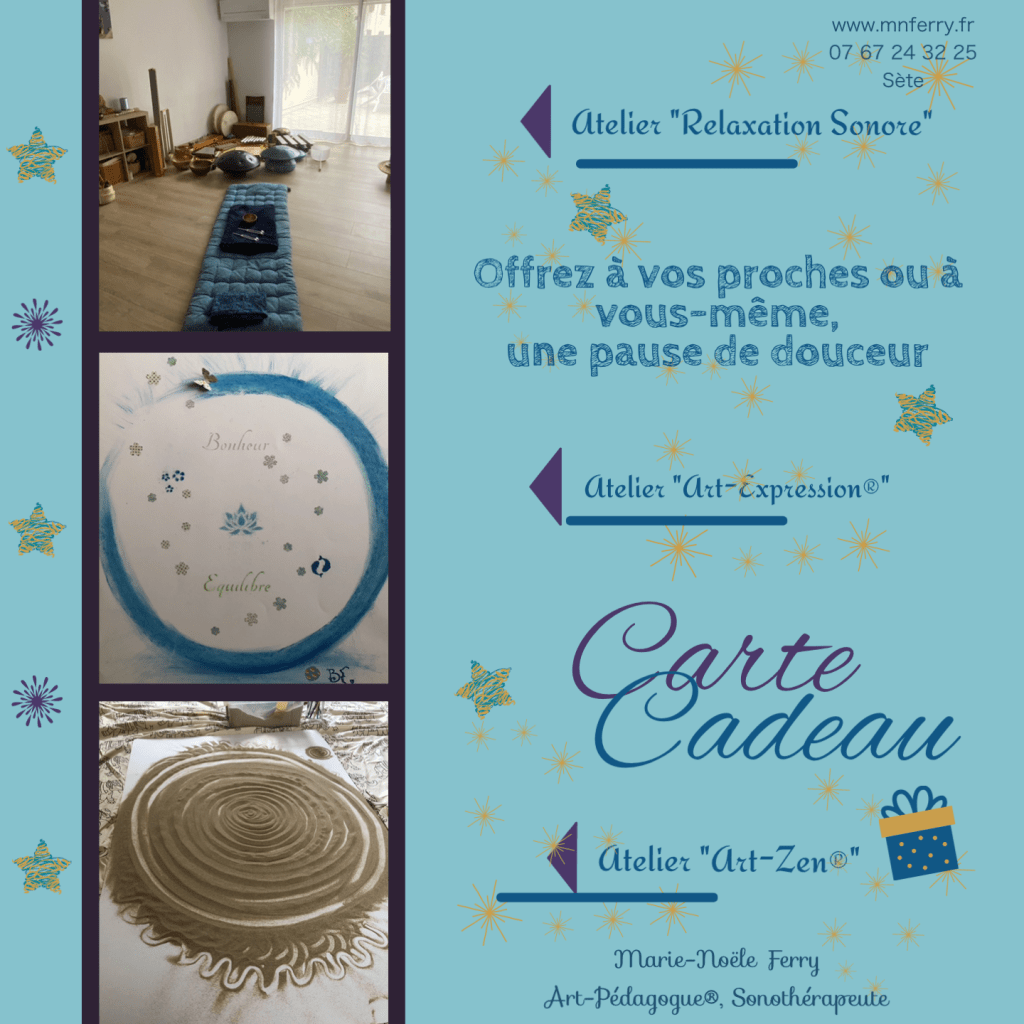 - Médiations sonores, Relaxations sonores,Ateliers Art-Pédagogie®, Art-Méditation®, qui allient pleine conscience et expression de soi pour une compréhension de soi et une meilleure présence au monde.