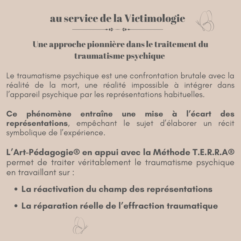 L’Art-Pédagogie® et la Méthode T.E.R.R.A® permettent de traiter véritablement le traumatisme psychique en travaillant sur :