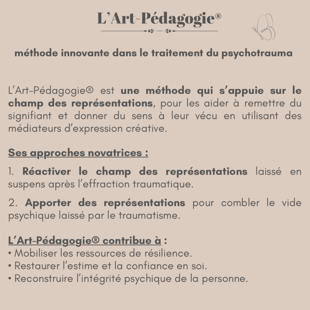 L’Art-Pédagogie® est une méthode qui s’appuie sur le champ des représentations, pour les aider à remettre du signifiant et donner du sens à leur vécu en utilisant des médiateurs d’expression créative. Elle favorise une meilleure compréhension de soi.